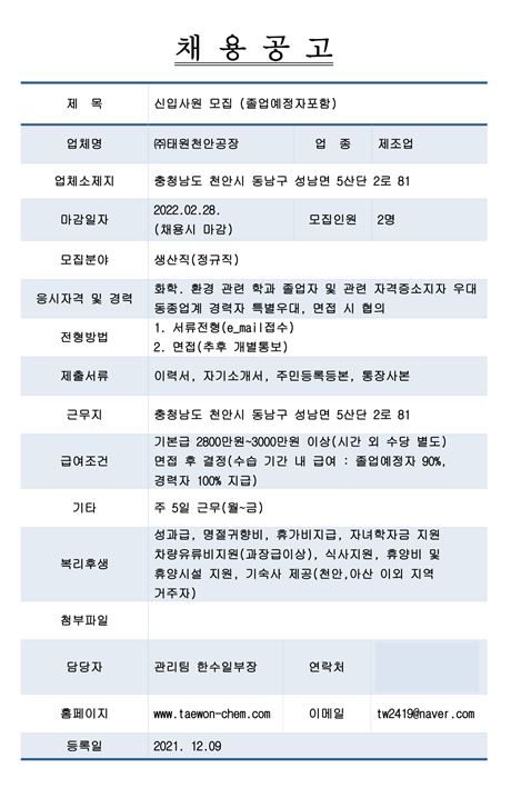 - [4학년] [취업] 채용공고 안내 (주)태원천안공장