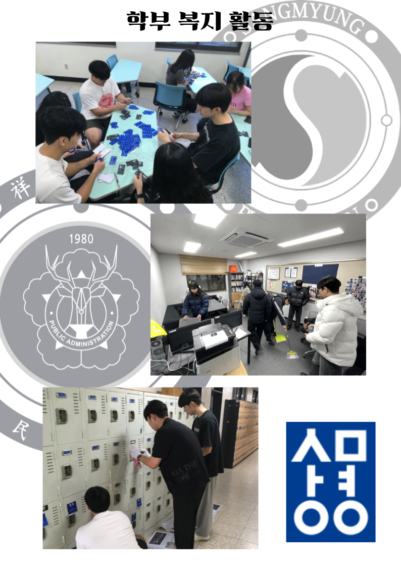 ▣ 복지부: 간식지원행사를 기획하고 학부 실습실 관리를 담당합니다. 학생들의 불편한 점을 개선하기 위해 설문조사 등 활용하여 학교생활의 질을 높일 수 있도록 노력합니다.